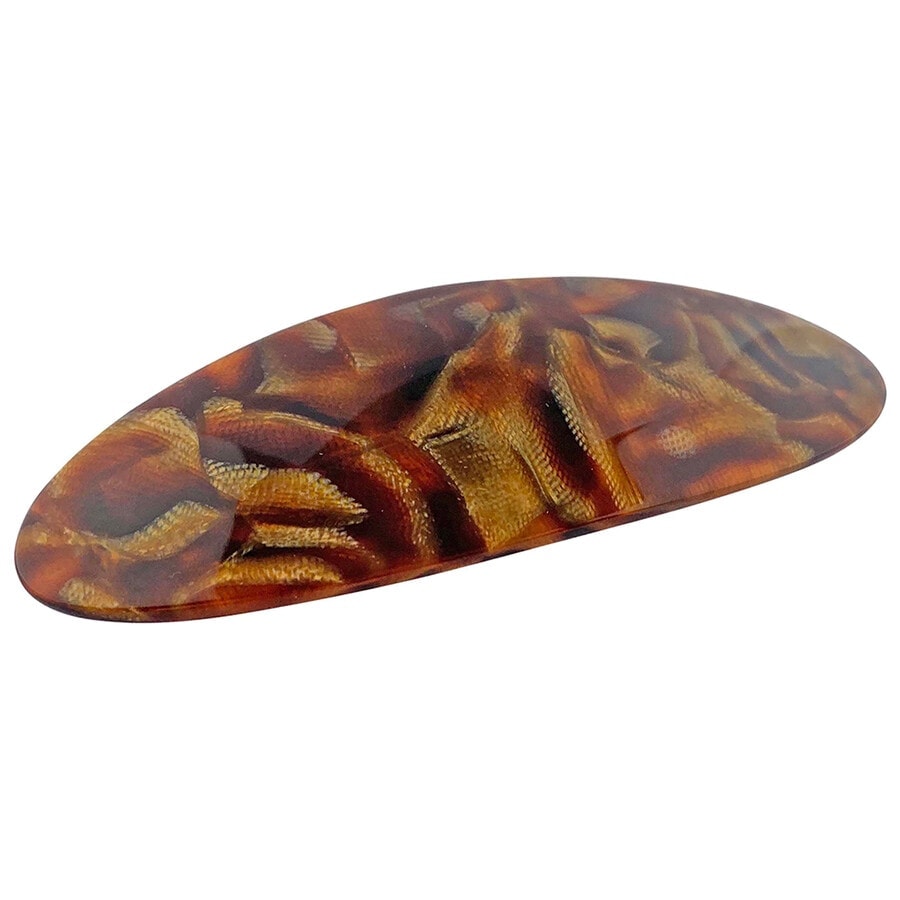 Als traditioneel merk gebruikt Oakland alleen de beste natuurlijke hars voor dit assortiment, ook wel bekend als Rhodoit. Rhodoit wordt gemaakt van katoen en harsen en vervolgens verwerkt in Frankrijk. De complexe en deels handgemaakte Rhodoit-haaraccessoires zijn uiterst comfortabel om te dragen. en hebben geen scherpe randen en wordt beschouwd als bijzonder zacht voor de hoofdhuid en het haar. Elke clip heeft zijn eigen patroon, daarom zijn Oakland haaraccessoires gemaakt van rhodoite echt uniek. Een hoogtepunt van de huidige collectie is de smalle patentclip in een gemarmerd ontwerp dat het haar zachtjes samenbindt en een prachtige blikvanger is in elk kapsel - een smaakvol accessoire dat niet mag ontbreken in een toilettas. Afmeting: 10cm x 3,5cm