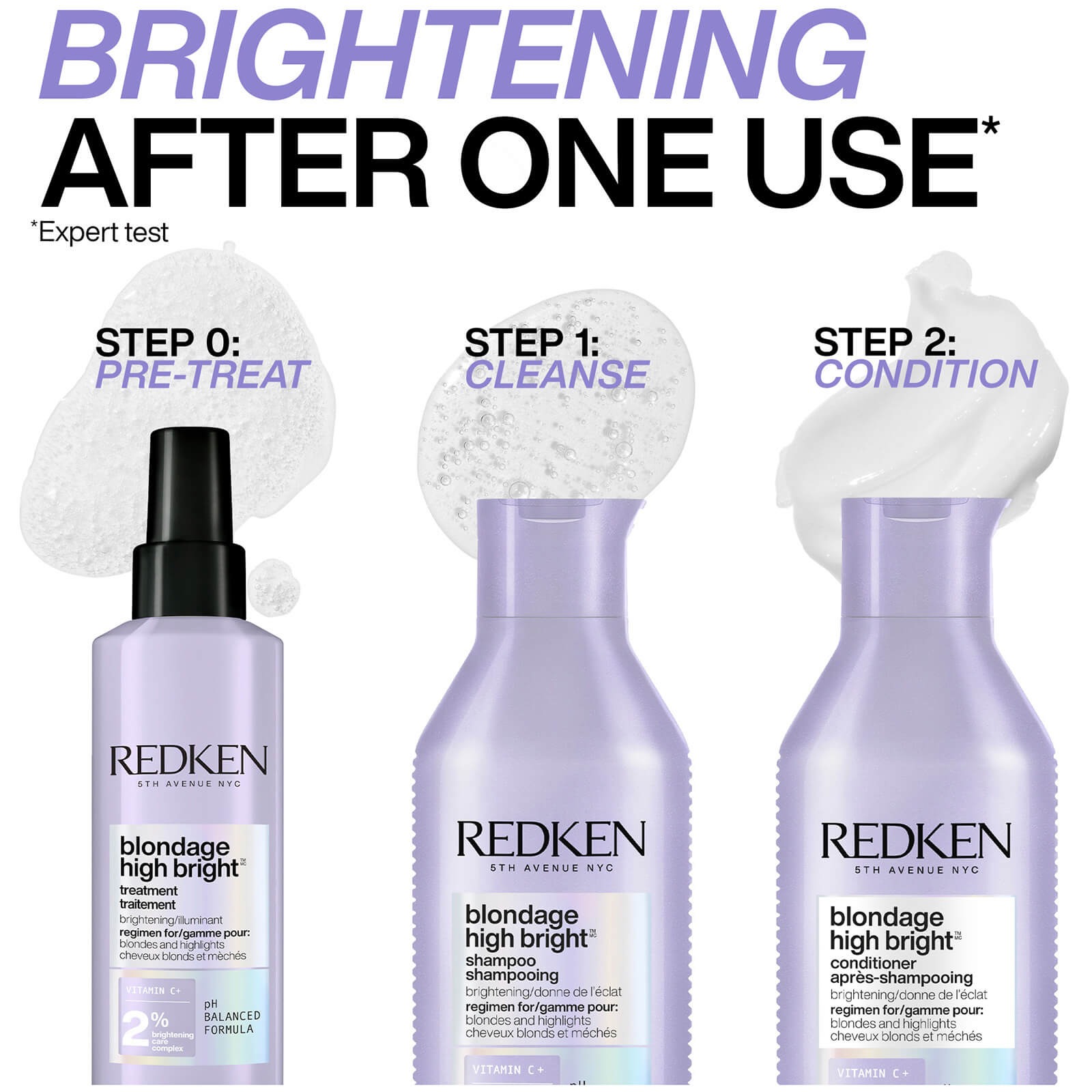Lifting build-up and impurities to reveal an instantly revitalised blonde hue, the Redken Blondage High Bright Conditioner seeks to maintain colour vibrancy between salon visits. Infusing the hair with moisture, the formula works to enhance manageability while leaving the lengths feeling soft and silky.The treatment is powered by a blend of vitamin C and Redken’s Brightening Care Complex, seeking to cleanse the hair of dulling agents and pollution for a radiant finish. Pair with the High Bright pre-shampoo treatment and shampoo for optimal results.