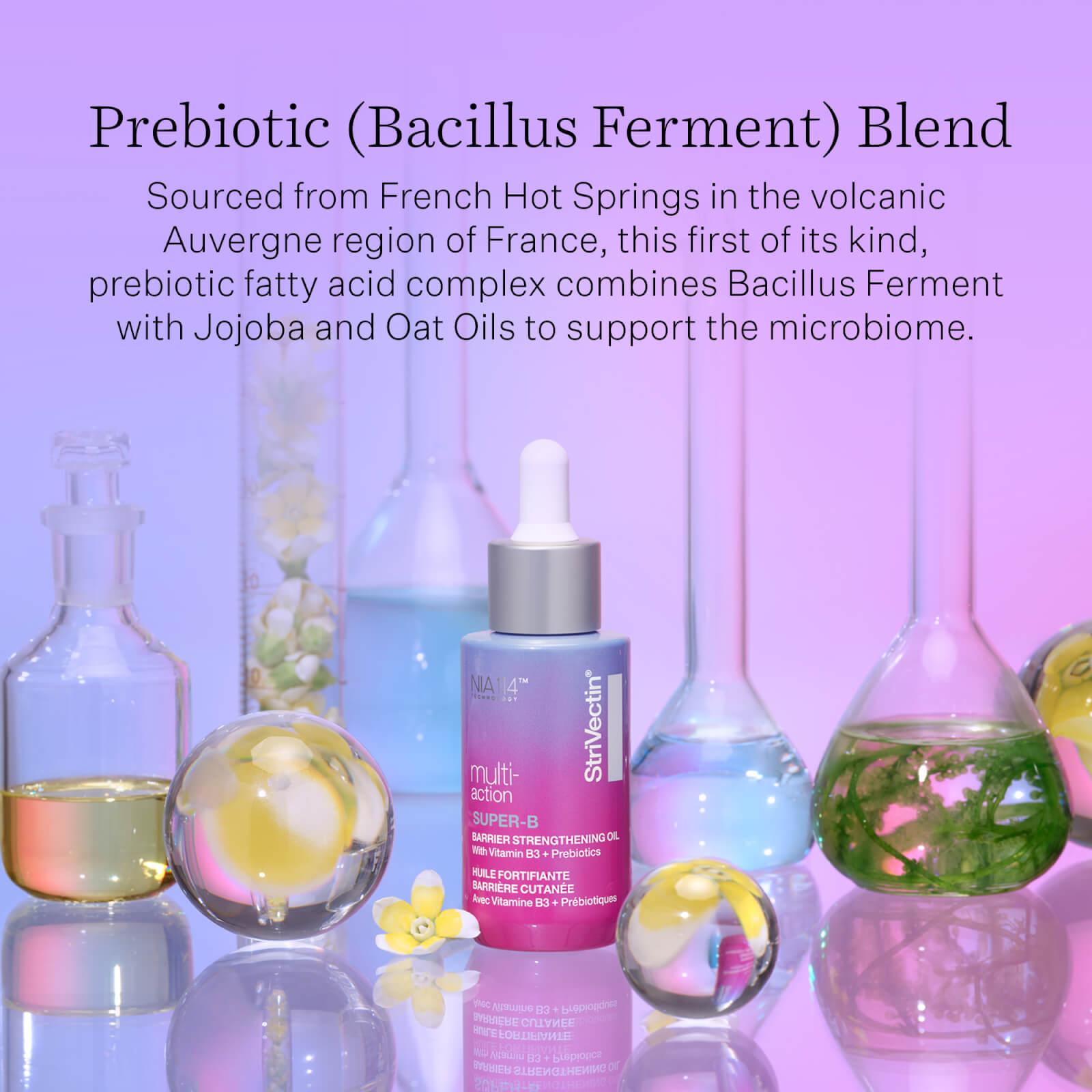 Drench your skin in moisture, with the StriVectin Super-B Barrier Strengthening Oil. The lightweight formula absorbs fast, avoiding the risk of any heavy residue being left behind.A cocktail of prebiotics, derived from French Hot Springs, work to feed the microbiome of your skin, encouraging a healthy-looking glow.A patented NIA-114™ Complex, comprised of niacin and vitamins, is said to strengthen your skin barrier, making it ideal for tired-looking skin. The appearance of fine lines is lessened, as a plumper illusion is summoned.