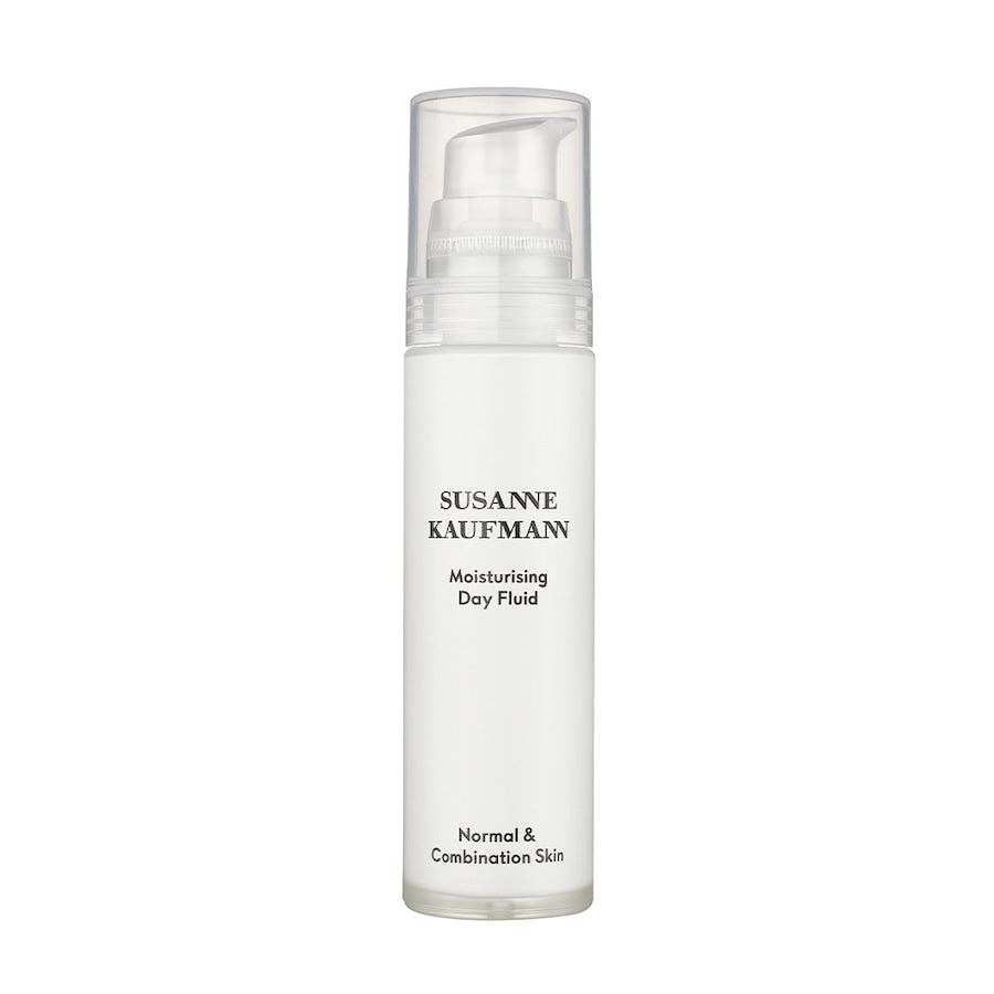 Susanne Kaufmann Hydraterende Dag Fluid met Verzorgend ComplexDe MOISTURISING DAY FLUID van Susanne Kaufmann richt zich specifiek op de behoeften van de gecombineerde huid en de huid die de neiging heeft vet te worden. Een krachtig verzorgend complex van hydraterend hyaluronzuur, vitamine E, jojoba-olie, huiseleek-extract, tomatenfruitextract en schisandra-fruitextract hydrateert de huid intensief en geeft haar een egale, evenwichtige en matte uitstraling. De zijdezachte vloeistof, die de huid niet verzwaart, verzacht roodheid en irritatie met bisabolol en geeft de huid stevigheid.