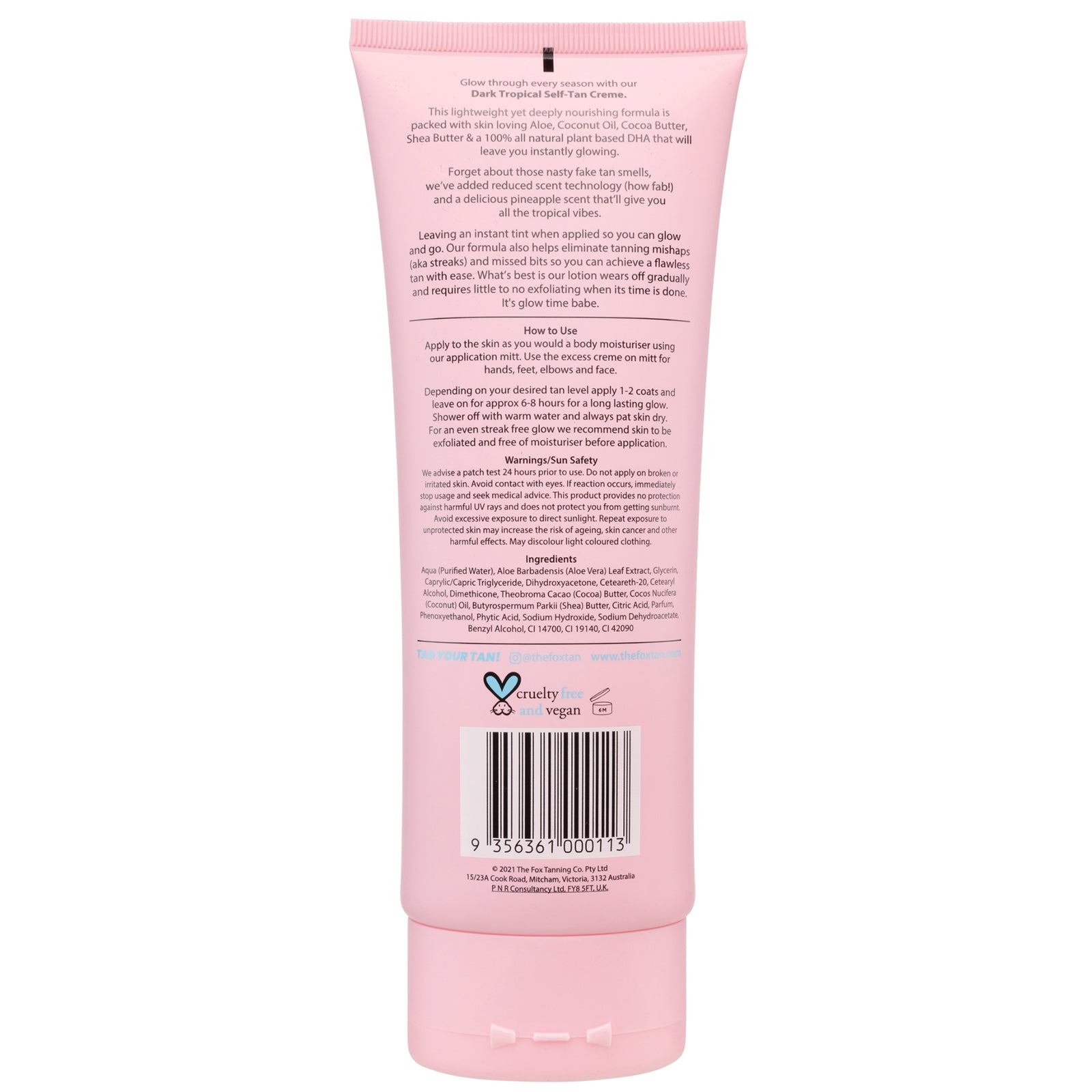 The Fox Tan Dark Tropical Self-Tan Crème: stralende gloedLaat je huid op elk moment van het jaar stralen alsof het door de zon is gekust - met de Dark Tropical Self-Tan Crème van The Fox Tan! Met 100% plantaardig DHA helpt de formule om je huid op natuurlijke wijze bruin te maken, terwijl aloë vera, kokosolie, cacao en shea butter je huid voorzien van belangrijke voedingsstoffen en waardevol vocht. De voedende zelfbruinende crème laat een prachtige gloed achter en zorgt voor een tropische sfeer met zijn heerlijke ananasgeur!