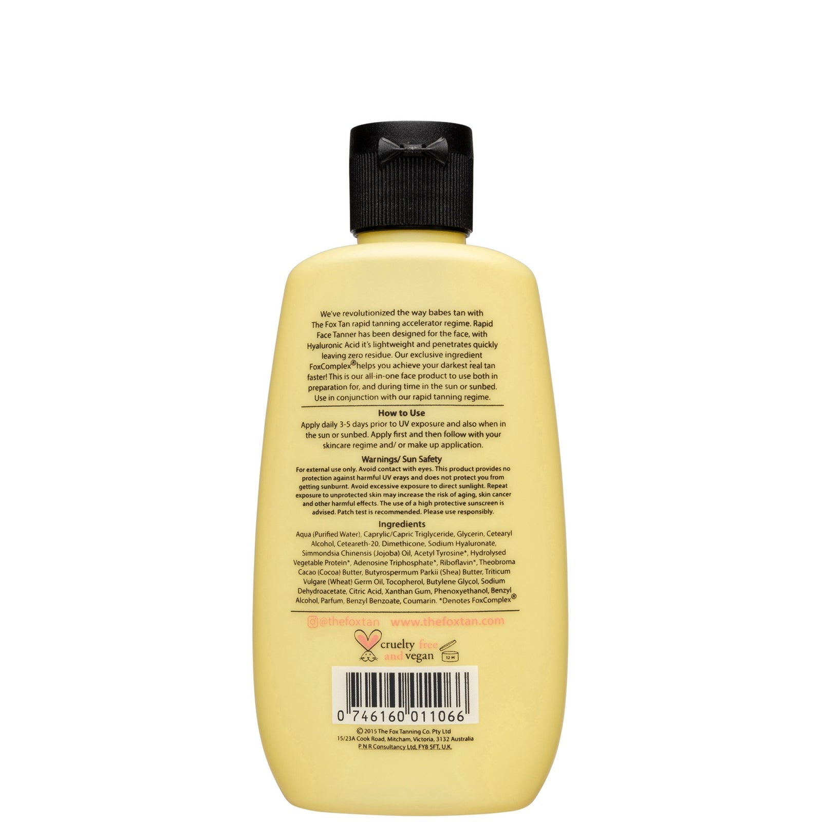 De Fox Tan Rapid Face Tan: intens bruin in een handomdraaiWil je in een handomdraai een prachtige bruine teint zonder de hele dag te hoeven zonnen? Dan is The Fox Tan's Rapid Face Tan de perfecte oplossing: met het exclusieve ingrediënt FoxComplex® stimuleert de unieke formule de melanineproductie van de huid en versnelt zo het natuurlijke bruiningsproces. Teint Dit geeft je een warme en zomerse gloed zonder dat je je huid lang hoeft bloot te stellen aan UV-stralen. De bruiningsversneller voor het gezicht is ook verrijkt met jojoba-olie, sheaboter en cacaoboter, die zorgen voor waardevolle hydratatie en de huid zacht laten aanvoelen.