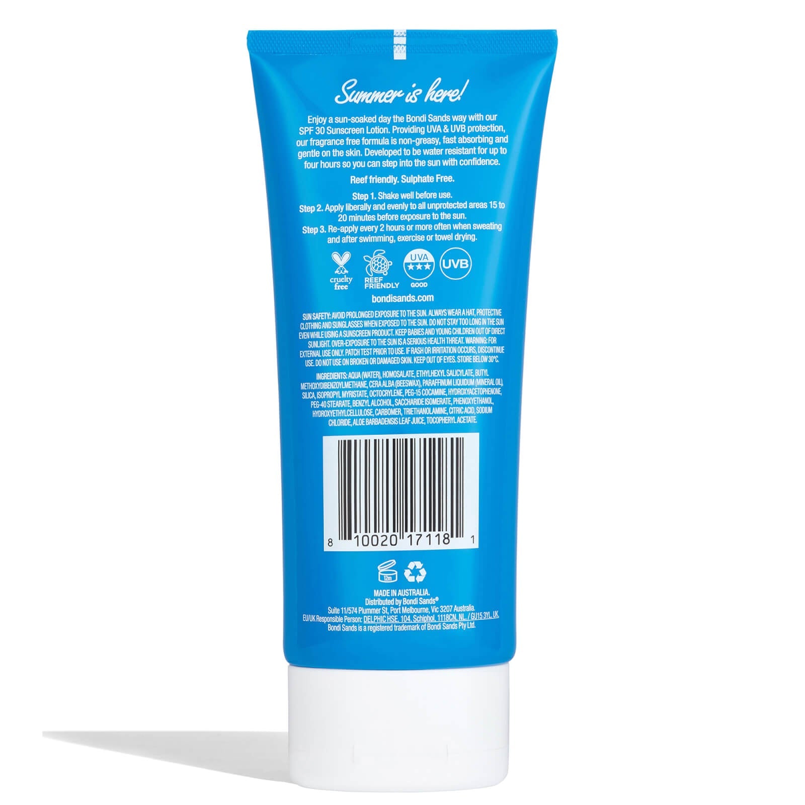 Bondi Sands Sunscreen Lotion Fragrance Free SPF30 en biedt UVA- en UVB-bescherming. De lotion is waterbestendig, niet-vettig, zacht voor de huid, trekt snel in en levert tot 72 uur hydratatie.Geniet van het mooie weer, ga met een gerust hart de zon in met Bondi Sands!• UVA- en UVB-bescherming• 80 minuten waterbestendig• 72-uur hydratatie• Geschikt voor de gevoelige huid
