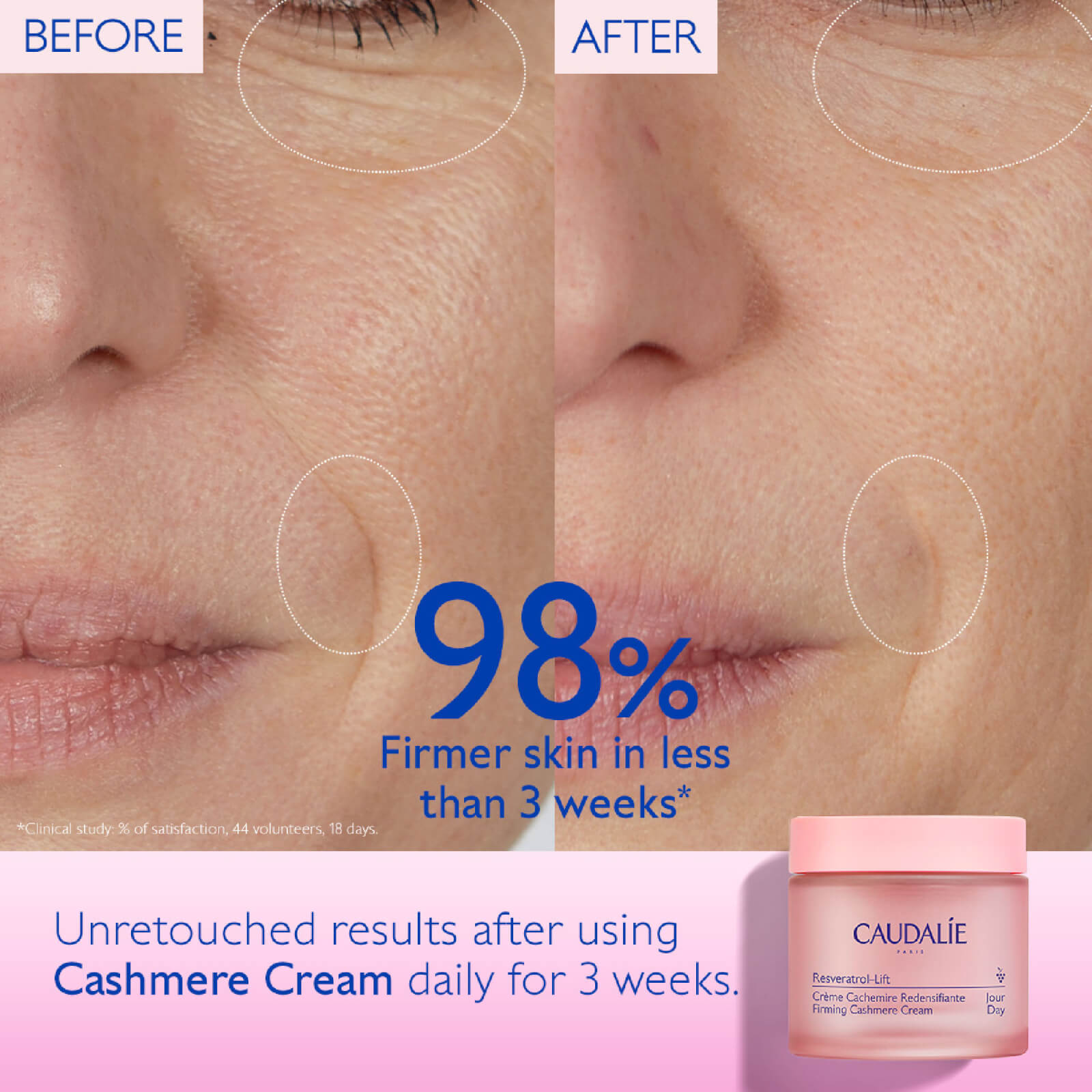 Introducing the Caudalie Resveratrol-Lift Cashmere Cream, an intensely nourishing moisturiser seeking to soften the appearance of visible signs of ageing. Formulated with mature skin types in mind, the facial cream works to smooth and plump the look of fine lines with a firmer-looking finish. Harnessing the powers of the brand's patented technology, advanced Vegan Collagen 1, the plant-based active creates a visible firming and lifting illusion. Micro-hyaluronic acid helps to improve the look of skin elasticity, creating a voluminous and plumper appearance. Its lightweight, whipped texture hosts a nourishing blend of shea butter and grape seed oil, to smooth and soften the feeling of skin and reveal a radiant-looking finish. Tested Results: 95% agree their skin looked firmer *Clinical trial with 42 women over 56 days.