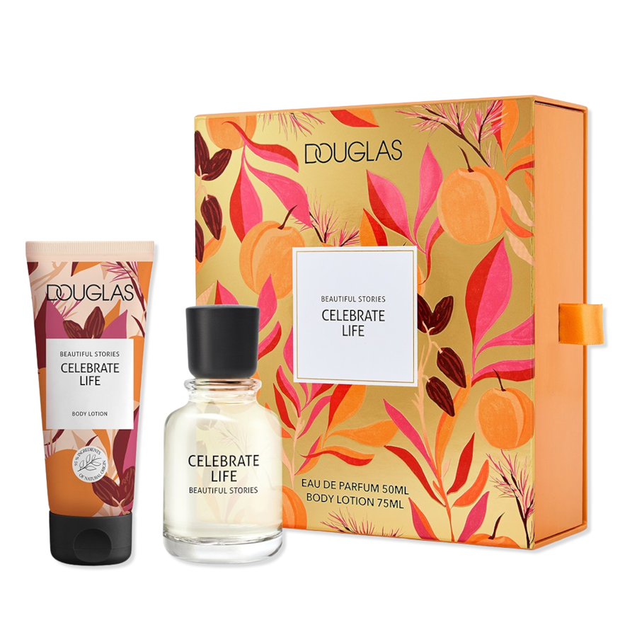 Douglas Beautiful Stories Celebrate LifeOntdek pure levensvreugde in een dubbelverpakking: deze tweedelige set bevat het zonnige Celebrate Life Eau de Parfum van Douglas Beautiful Stories samen met een perfect bijpassende bodylotion. Het parfum, dat voor 99,9% bestaat uit ingrediënten van natuurlijke oorsprong, opent met een mix van sappige abrikoos en bloedsinaasappel. Nuances van romige tonkaboon smelten samen met appelolie voordat cederhout de compositie zachtjes afrondt. De hydraterende lichaamsverzorging is verrijkt met 95% ingrediënten van natuurlijke oorsprong, smelt op de huid en laat haar superzacht aanvoelen. En omdat de doos net zo vrolijk is als de inhoud, is de set ook perfect als cadeau voor je geliefden!