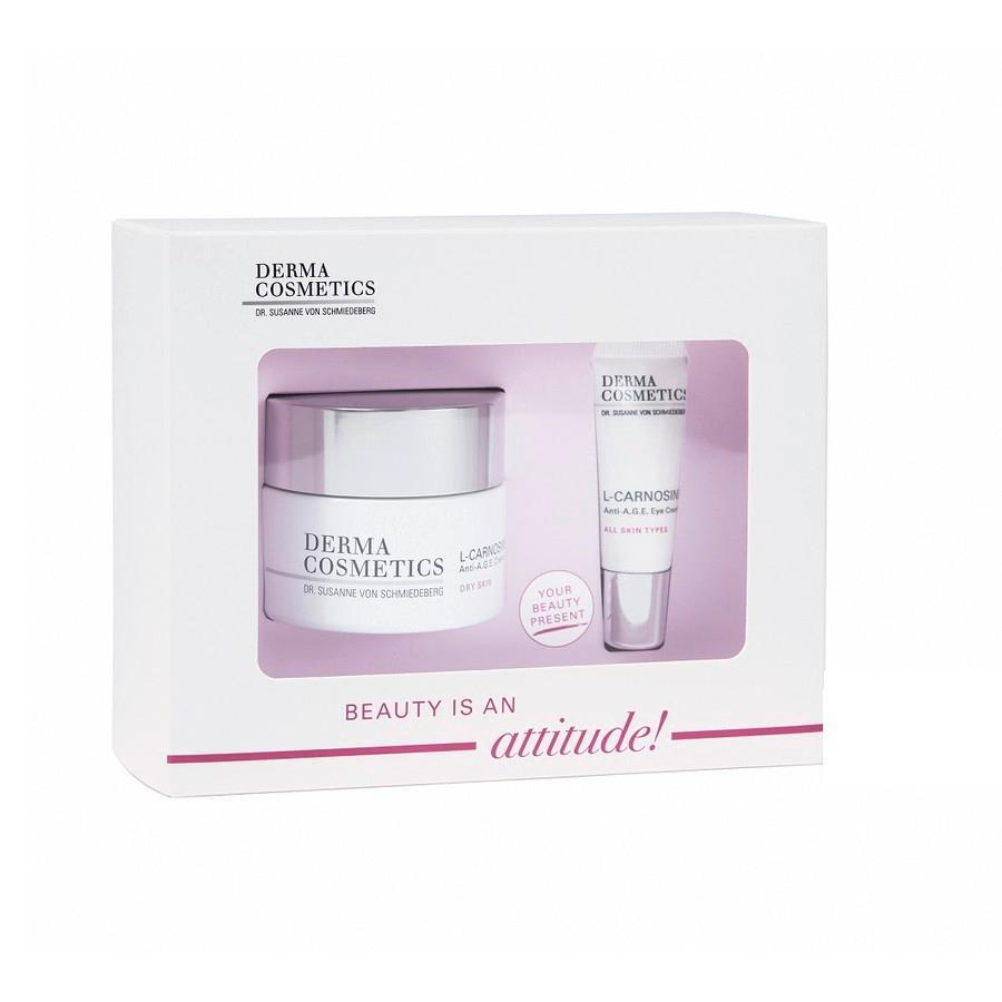 De Value Set 1 van Dermacosmetics bevat: L-Carnosine Anti-A.G.E. Crème Voor de droge huid, origineel 50 ml: de L-Carnosine Anti-A.G.E. Crème voor de droge huid vermindert de glycatie van de cellen dankzij L-Carnosine. Lactil voorziet de huid van intensief vocht. Anti veroudering. Oog creme: Voor alle huidtypes, presenteer 7 ml: The L-Carnosine Anti-A.G.E. Oogcrème vermindert de glycatie van de cellen en stimuleert de huideigen collageenproductie dankzij L-Carnosine en Vigna acontifolia-extract. Bevordert celvernieuwing en vermindert zwelling en rimpels. Ook geschikt voor de gevoelige huid.
