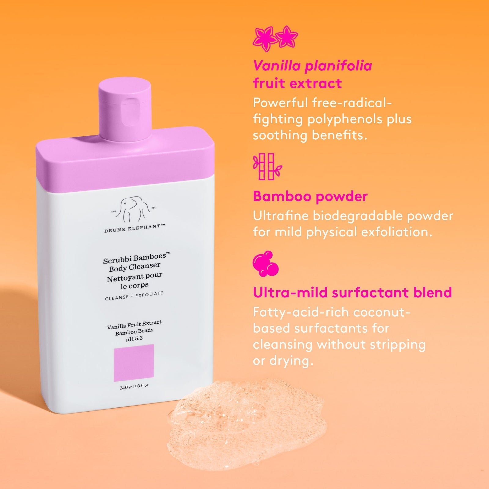 Drunk Elephant - Scrubbi ™ Vanilla Body CleanserEen exfoliërende, antioxidantrijke gel-naar-schuim body cleanser die grondig reinigt, verzacht, hydrateert en kalmeert met een milde, natuurlijk zoete vanillegeur.Ultra-milde oppervlakteactieve stoffen verwijderen zweet, vuil en overtollige vetten, terwijl ultra-fijne, biologisch afbreekbare bamboeparels droge, ruwe zones zachtjes scrubben, waardoor de huid zijdezacht aanvoelt. Een mix van chiazaad-, lijnzaad- en marulaolie, rijk aan vetzuren, hydrateert de huid en een snel absorberende blend van aminozuren helpt de huid te versterken. Natrium PCA en squalaan houden het hydratatieniveau op peil, voorkomen waterverlies en verbeteren de barrièresterkte; antioxidanten helpen te kalmeren en te verzachten.Scrubbi Bamboes™ heeft een huidvriendelijke pH van 5,3.FYI: Scrubbi Bamboes™ bevat vanillevruchtenextract, dat is toegevoegd vanwege zijn antioxiderende en kalmerende eigenschappen voor de huid. De vanillevrucht geeft deze formule bovendien een natuurlijk zoete geur die snel vervliegt.Vrij van sulfaten, siliconen, essentiële oliën, geurstoffen, kleurstoffen en uitdrogende alcoholen. Vegan en dierproefvrij.Hoofdingrediënten:Vanille Planifolia-vruchtenextract: Afkomstig van de zaden van de vanilleplant. Vanillevruchten worden gebruikt vanwege hun krachtige concentratie van vrije-radicalen bestrijdende polyfenolen en hun verzachtende eigenschappen. De zaden van de vanilleplant hebben een milde, natuurlijk zoete geur.Bamboepoeder: Ultra-fijn poeder afkomstig van biologisch afbreekbare bamboestengels. Gebruikt als een milde fysieke scrub.Ultra-milde mix van oppervlakteactieve stoffen: Verschillende milde reinigende bestanddelen, waaronder oppervlakteactieve stoffen op basis van kokos, rijk aan vetzuren, werken samen om een romig schuim te creëren dat vuil en andere stoffen effectief van de huid verwijdert zonder de huid te beschadigen of uit te drogen.