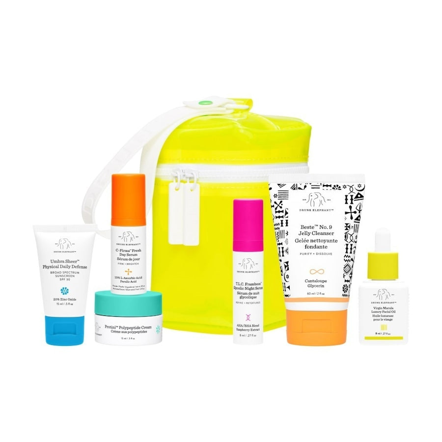 Drunk Elephant - The Littles 6.0™Een set van 6  ochtend en avond essentials om je huid te reinigen, exfoliëren, hydrateren, laten stralen en te herstellen in slechts 30 dagen.Het gebruik is makkelijker dan je denkt! Kies producten voor een ochtend en avond routine gebaseerd op wat jouw huid nodig heeft (dit kan verschillen per dag).Maak een smoothie door de producten te mengen en breng ze samen aan.De heldere jelly bag is perfect om je badkamer op te fleuren en overzichtelijk te houden, zowel thuis als onderweg.Wat zit er in:• C-Firma™ Fresh Day Serum (9ml) - Verheldert en verstevigt.• Protini™ Polypeptide Cream (15 ml) - Verbetert de teint, textuur en stevigheid van de huid.• Umbra Sheer™ Physical Daily Defense SPF30 (15 ml) - Biedt UVA/UVB-bescherming.• Beste™ No. 9 Jelly Cleanser (60 ml) - Verwijdert alle sporen van make-up en vuil.• T.L.C. Framboos™ Glycolic Night Serum (8 ml) - Herstelt een doffe, verstopte huid door de dode huidcellen voorzichtig te verwijderen• Virgin Marula Luxury Facial Oil (8 ml) - Voedt en balanceert. Deze set heeft een totale waarde van €108,-