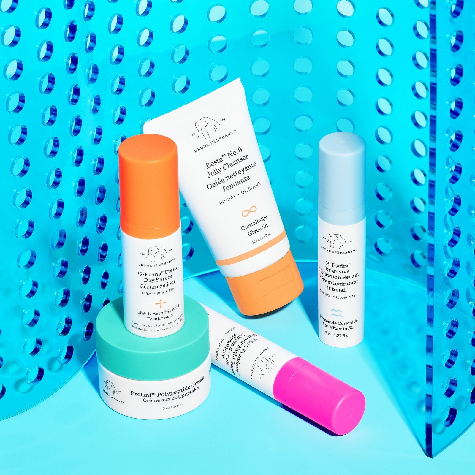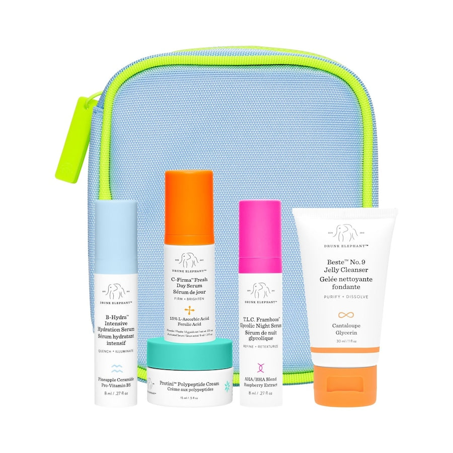 Vijf essentials in reisformaat voor jouw ochtend- en avondroutine die de huid reinigen, exfoliëren, hydrateren, verhelderen, aanvullen en er weer gezond uit laten zien.C-Firma verheldert en verstevigt; B-Hydra biedt onmiddellijk langdurige hydratatie; Protini Cream verbetert de teint, de textuur en de stevigheid van de huid; Beste No. 9 verwijdert alle sporen van make-up en vuil; T.L.C. Framboos exfolieert mild de huid.Deze set bestaat uit: Beste Cleanser 30ml C-Firma Fresh 9ml T.L.C. Framboos 8ml Protini Cream 15ml B-Hydra 8ml ToilettasDe baanbrekende skincare-filosofie van Drunk Elephant: klinisch bewezen effectieve producten formuleren met huidvriendelijke, op onderzoek gebaseerde ingrediënten. Zonder de zes ingrediënten die aan de basis liggen van talloze huidproblemen en door Drunk Elephant de Suspicious 6 worden genoemd. 1. Essentiële oliën2. Uitdrogende alcohol3. Siliconen4. Chemische zonnefilters5. Geur- en kleurstoffen6. SLSDoor uitsluitend Drunk Elephant producten te gebruiken (wat de brand een Drunk Break™ noemt) zal de huid haar evenwicht terugvinden en er weer gezond uitzien.