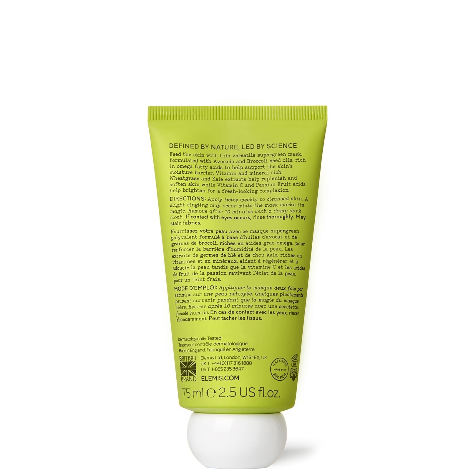 Het ELEMIS Superfood Vital Veggie Mask voedt, hydrateert en verheldert in slechts 10 minuten de doffe, lusteloze huid met een vleugje groene goedheid. De groengekleurde, op smoothies geïnspireerde behandeling bevat een groot aantal heilzame ingrediënten, waaronder voedende supergroente, passiefruitzuur voor een stralende huid en een natuurlijk, van suiker afgeleid prebioticum. Dode huid en onzuiverheden worden effectief verwijderd voor een gladdere, meer verfijnde textuur. Tarwegras-, boerenkool- en brandnetelextracten bevorderen samen een stralende, glanzende teint. Geschikt voor alle huidtypes. Geschikt voor veganisten. Unisex. Diervriendelijk.
