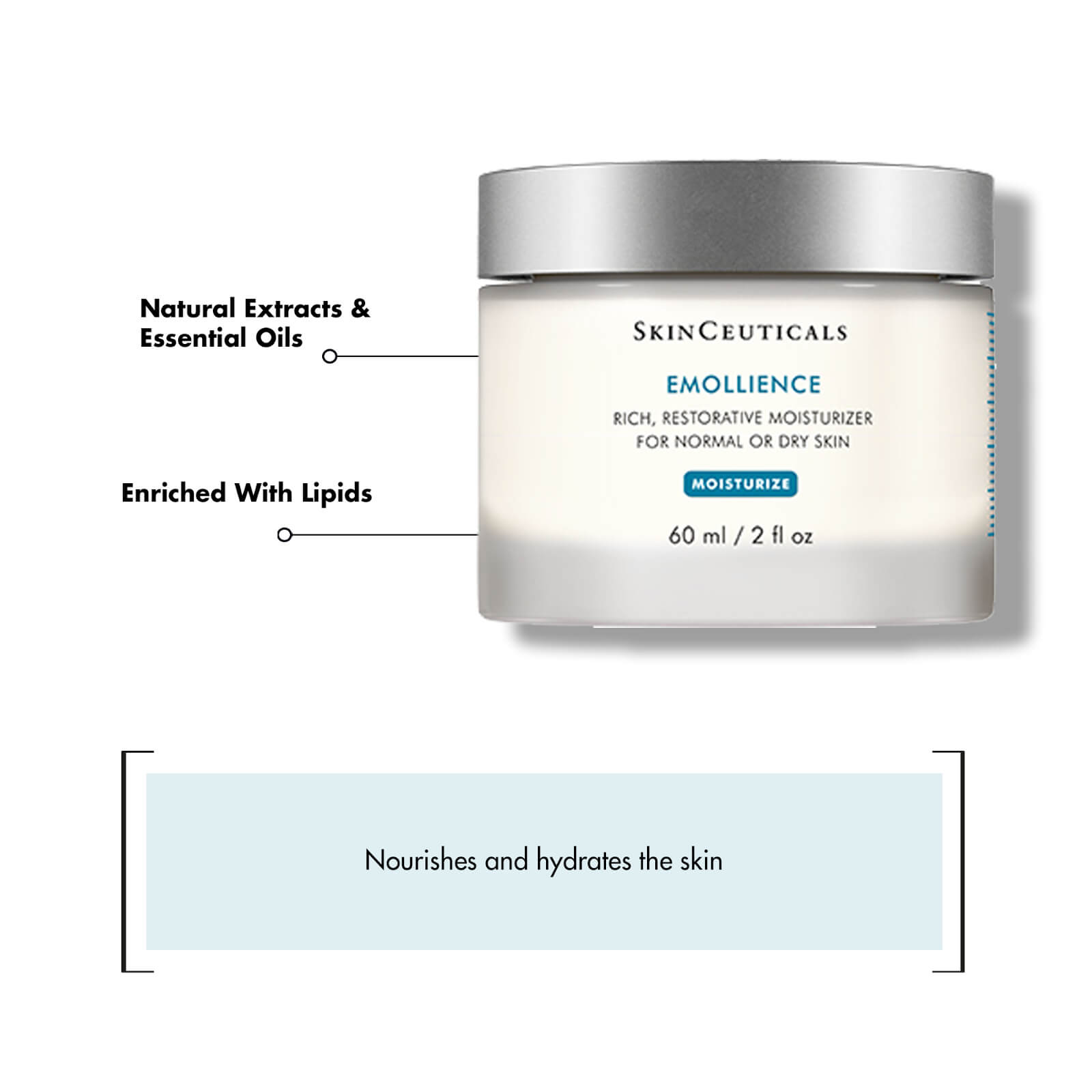 Catering specifically for normal, dry or sensitive skin, the Emollience Moisturiser from SkinCeuticals works to replenish, revive and nourish thirsty complexions.Synergising three Brazilian Algae Extracts, the nutrient-rich daily formula absorbs quickly and evenly to deliver long-lasting hydration, whilst a blend of Grape Seed, Rosehip and Macadamia Nut Oils restore softness and suppleness. Ideal for high altitudes and cold or dry climates.Suitable for dry or sensitive skin types.Made in the USA.