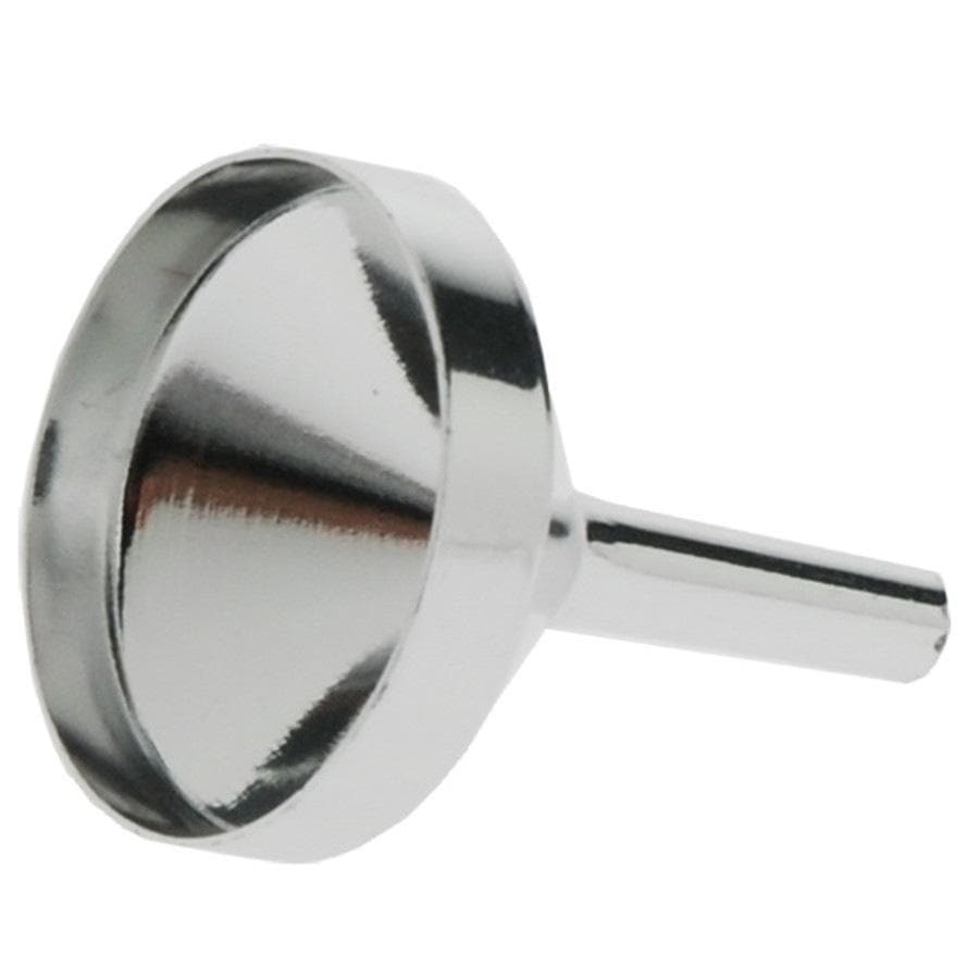 Zilverkleurige metalen parfum trechter.Afmeting: 2,5x3,5 cm. Ø boven 2,5 cm, Ø onder 0,5 cm, lengte 3 cm