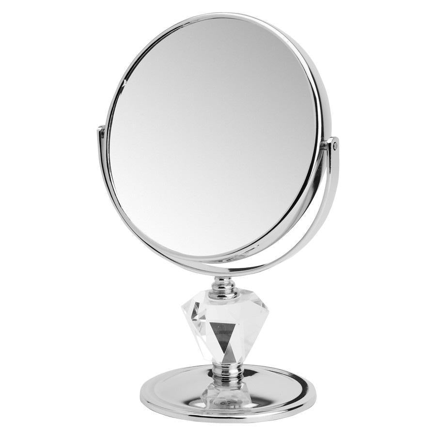 Vergrotende luxe spiegel met een diamant als voetje. Een waar sieraad in uw badkamer. 24 cm hoog.