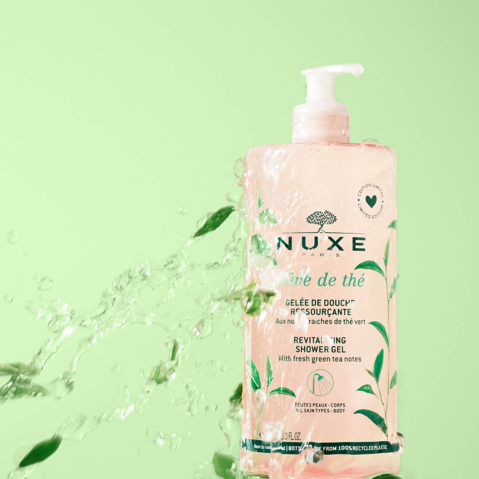 Nuxe - Rêve de Thé Shower GelOndek de verkwikkende douchegel Rêve de Thé in uiterst rijkelijk limited edition groot formaat. Deze zinnenstrelende douchegel van Nuxe met heerlijk parfum met de frisse noten van groene thee, reinigt de huid op milde wijze, voor een zachte en comfortabele huid.De zachte textuur transformeert tot een fijn schuim dat gemakkelijk kan worden afgespoeld. Een tijdloos moment voor lichaam en geest.Een gebaar voor uw huid met 95% ingrediënten van natuurlijke oorsprong.Flacon van 100% gerecycled plastic. Product ontwikkeld en vervaardigd in Frankrijk.