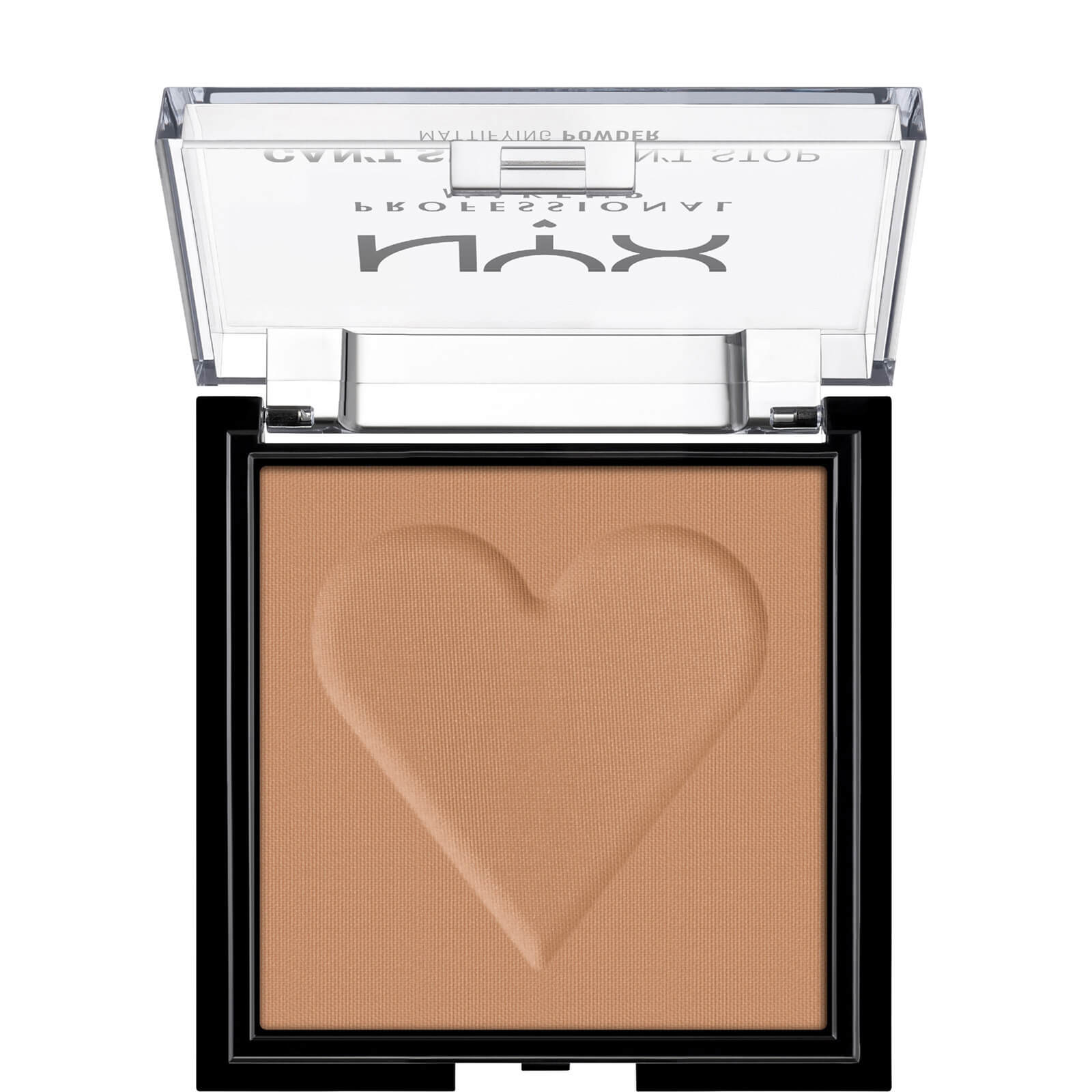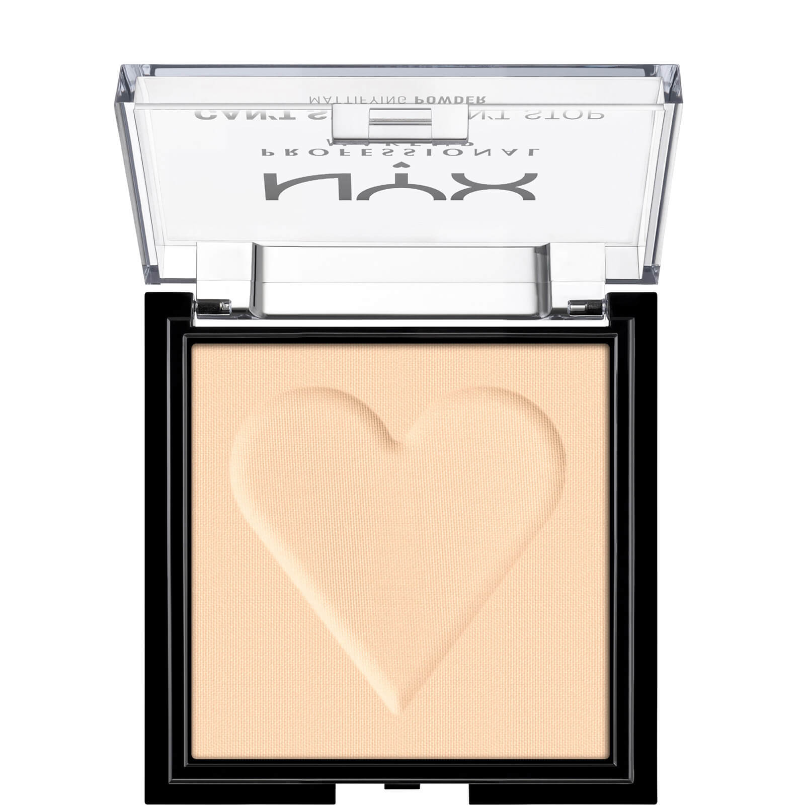 NYX Professional Makeup Can't Stop Won't Stop Mattifying Poeder De Can't Stop Won't Stop matterende poeder laat de huid er onmiddellijk ultra-mat uitzien en minimaliseert het verschijnen van olie en glans. Deze lichtgewicht formule biedt de hele dag een gladde, matte finish zonder er droog, cakeachtig of ashy uit te zien voor een perfecte huid. De translucent maar opbouwbare tinten zijn makkelijk te blenden zonder in fijne lijntjes te nestelen voor een gelijkmatige, gladde afwerking. Dit matterende poeder vertraagt make-up slijtage en geeft een matte afwerking van foundation zonder af te geven. Dit poeder minimaliseert het uiterlijk van olie en glans de hele dag voor een ultra-matte finish die de hele dag niet hoeft te worden bijgewerkt. Voordelen Getinte setting poeder Zacht en geeft geen vlekken Verkrijgbaar in 12 tinten