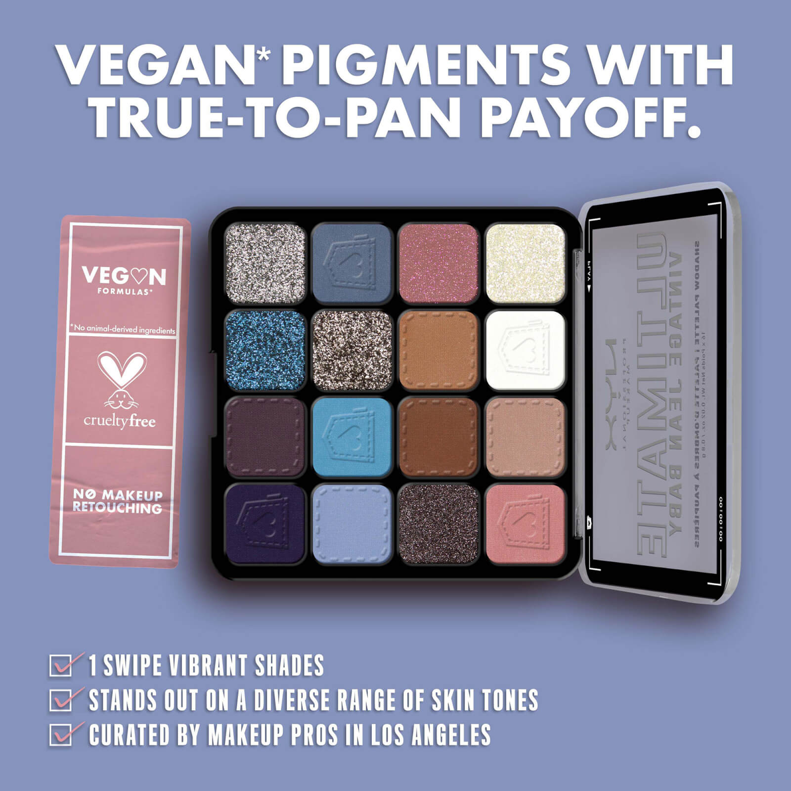 NYX - Ultimate Shadow Palette Vintage Jean BabyVerander je look wanneer je maar wilt met de Ultimate Shadow oogschaduwpaletten! Geselecteerd door professionals en ontworpen om een brede waaier aan artistieke looks te creëren. Kies een palette voor elke mood: levendige, bruisende kleuren van vintage jeansblauw tot elektrische, tropische kleuren en nude kleuren. Er is een palette voor elke look en elke mood! Creëer je ultieme look dankzij de oogschaduwkleuren en door NYX geselecteerde veganistische formules.16 gepigmenteerde oogschaduwsOp elkaar afgestemde, trendy tintenEen mix van matte, satijnen, glanzende en metallic formules