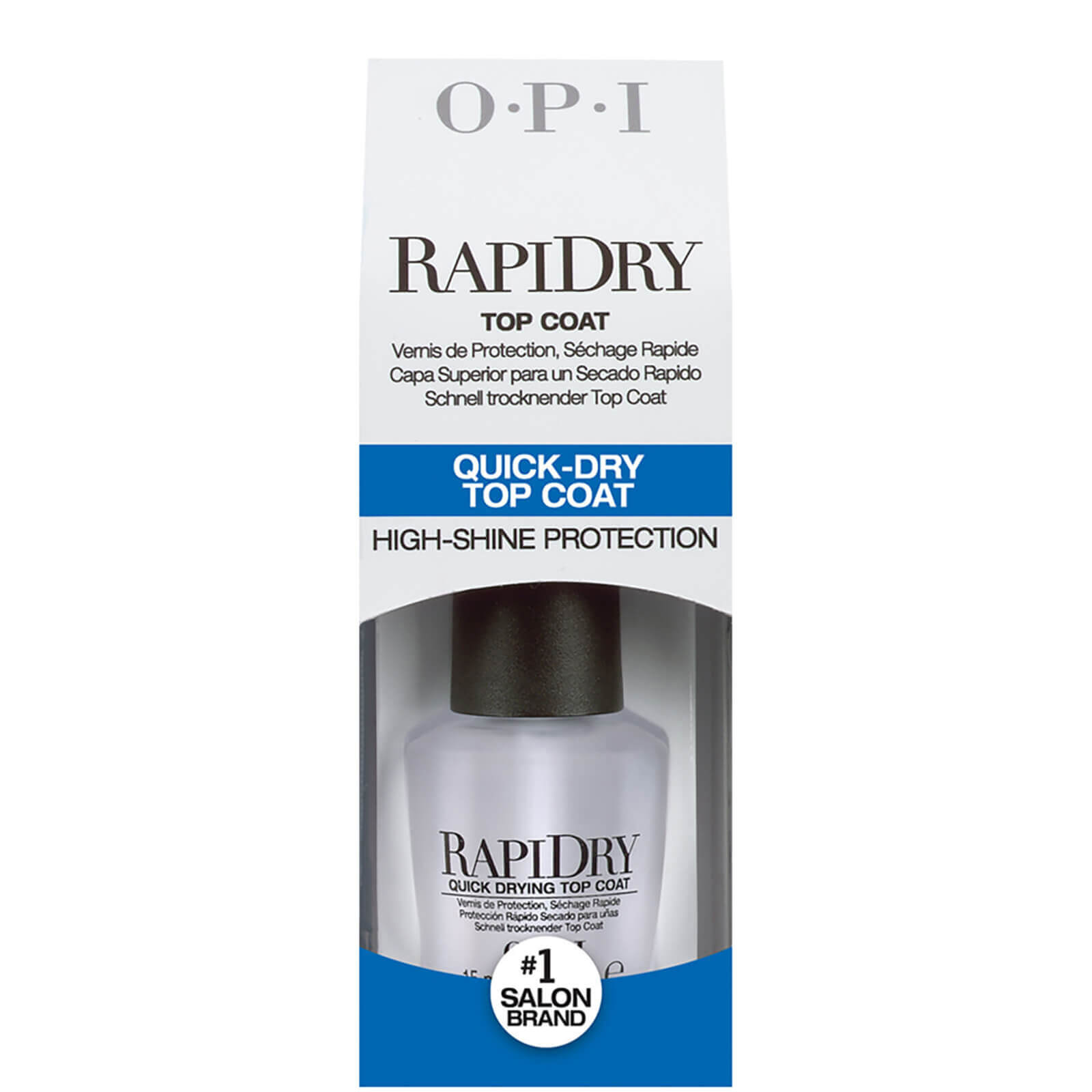 Set your manicure in place with OPI RapiDry Top Coat, a clear top coat that speeds up the drying time of your favourite nail polishes and adds quick drying protection to your nails.Delivering a high-shine finish that helps to prevent smears, smudges and chips in your polish, the top coat speeds up drying time of nail varnish and can even be worn alone to add glossy shine to natural nails in minutes. Ideal for last minute or on-the-go manicures, the fast-drying formula will dry your nails quickly and effectively for a long-lasting manicure with no risk of yellowing.