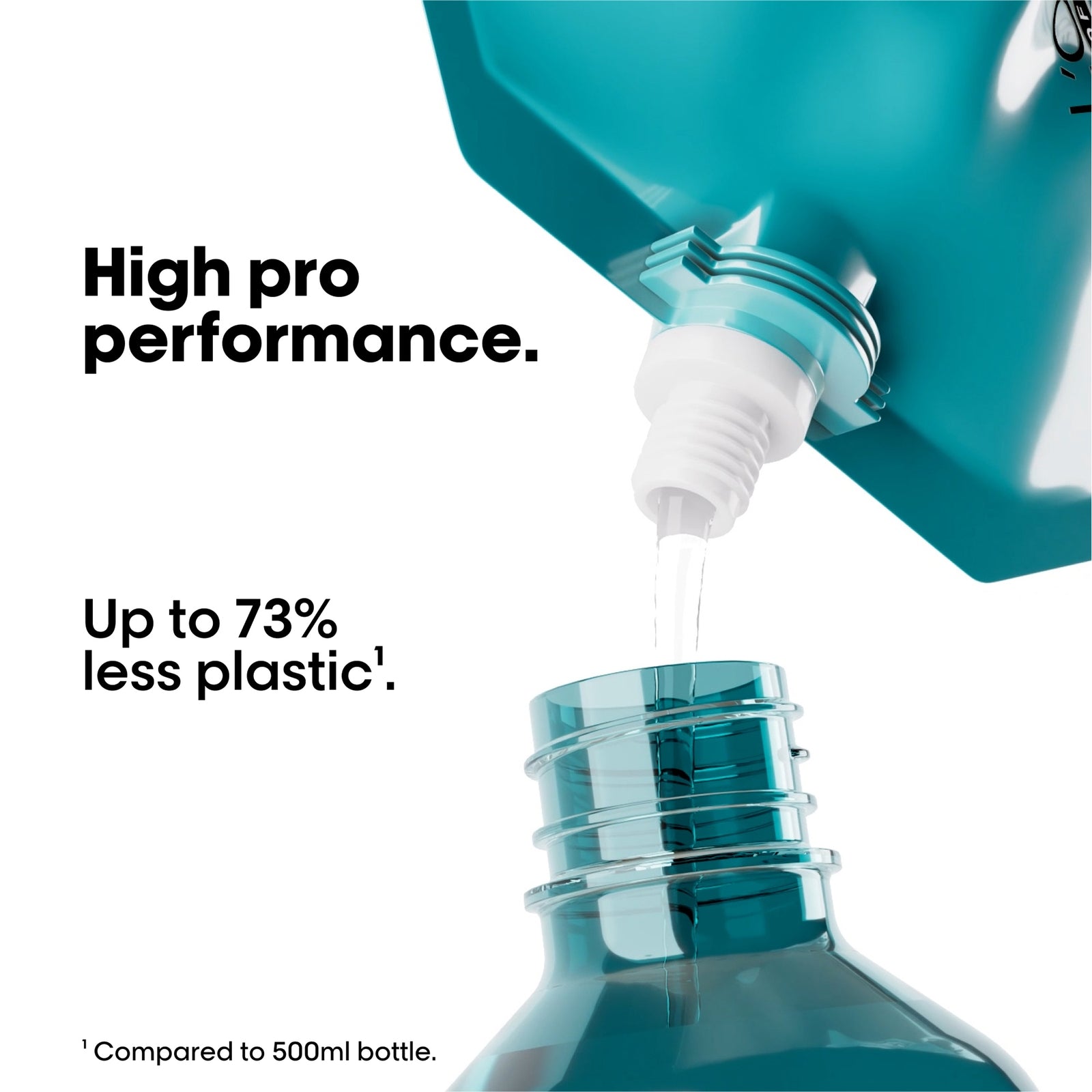 L’Oréal Professionnel Scalp Advanced Shampoo is een professionele behandeling ontworpen voor een gevoelige hoofdhuid. De shampoo is verrijkt met Niacinamide en Vitamine B3 die de hoofdhuid reguleren en hydrateren. De formule helpt de huidbarrière beter bestand te maken tegen schadelijke factoren, terwijl de hoofdhuid op milde wijze gereinigd en verzacht wordt. Als duurzaam alternatief zorgt de refill verpakking ervoor dat je gemakkelijk een bestaande verpakking kunt navullen. Vul je verpakking van 300ml of 500ml met de navulling waardoor je 73% minder plastic gebruikt** Vergeleken met 500ml fles. EU U&A gemiddeld verbruik van 3x shampoos per week, 10g per keer.De Scalp Advanced Shampoo van L’Oréal Professionnel is speciaal ontwikkeld om een gevoelige hoofdhuid te beschermen en het haar nieuw leven in te blazen. Dankzij een milde samenstelling uit Niacinamide en Vitamine B3 wordt de hoofdhuid zachtjes gereinigd voor soepeler en stralender haar. De zachte gel-textuur in combinatie met een licht parfum bestaande uit bergamot, iris en lavendel, staat garant voor een moeiteloze applicatie zonder irritaties te veroorzaken. Bovendien laat deze refill verpakking van de shampoo je toe om gemakkelijk een bestaande verpakking na te vullen, wat bijdraagt tot de duurzaamheid van het product