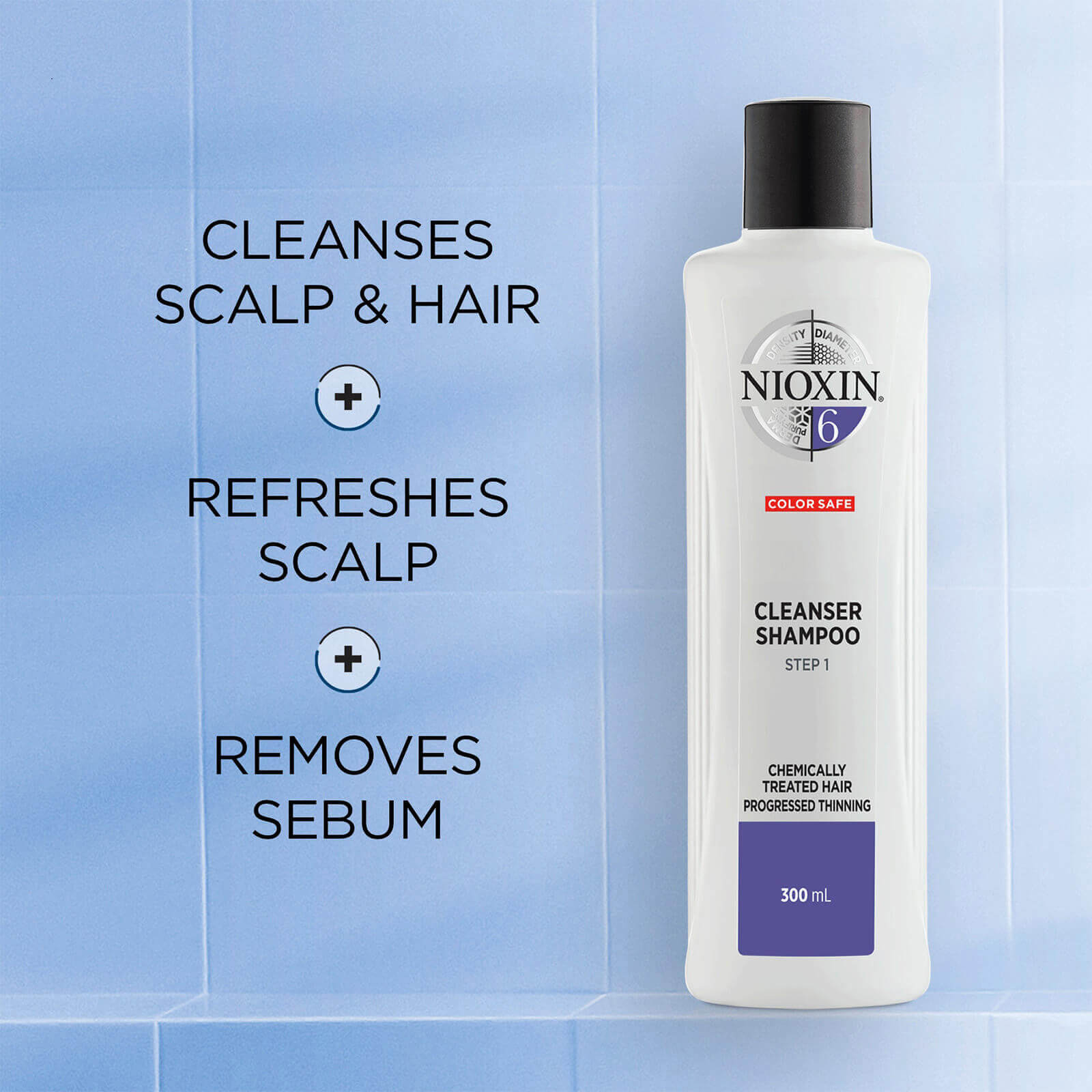 De Nioxin 3-Part System 6 Cleanser Shampoo for Chemically Treated Hair with Progressed Thinning is de eerste stap in een innovatieve driestappenbehandeling, samengesteld om het uiterlijk van dikker, voller haar te bevorderen.De shampoo bevat Glyco-Shield 2.0-technologie en is ontwikkeld om zowel het haar als de hoofdhuid op milde wijze te ontdoen van overtollige olie, vetzuren en onzuiverheden, waardoor het een gerevitaliseerd oppervlak krijgt. De shampoo omhult lokken met zijn versterkende eigenschappen en helpt het haar van wortel tot punt te voeden en te versterken.