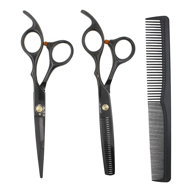 Kappers ingesteld met twee schaar en een kam. De set bevat een schaar voor het knippen van haar en schaar om het haar uit te dunnen. Deze set is ideaal als je je haar thuis moet knippen.
