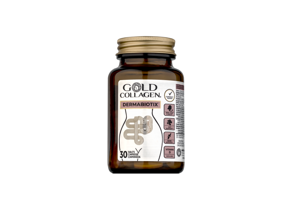 GOLD COLLAGEN® DERMABIOTIX has an innovative triple layer tablet technology that delivers 3 billion live bacteria to the gut, with a controlled release. This healthy probiotic-based tablet is enriched with biotic cultures, Ginger, vitamins, minerals and more, promote good skin, hair, nail and gut health.