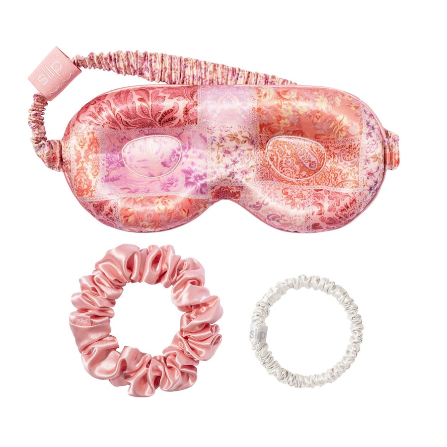 Slip Boteh Schoonheidsset: Slaapmasker & scrunchies in een setOf je nu op reis bent of thuis - met de 3 feelgood highlights uit de Boteh Beauty Set van Slip voeg je een vleugje luxe toe aan je schoonheidsslaapje en krijg je er twee prachtige haaraccessoires bij! Het slaapmasker is gemaakt van het unieke slipsilk™ materiaal en biedt zowel perfecte bescherming tegen licht als ongelooflijk comfort. Het heeft ook een betoverende mix van patronen in delicate roze tinten en zal je nachtrust tot een waar genot maken. De twee scrunchies - een extra dunne en een brede - zijn verkrijgbaar in twee kleuren die bij het masker passen. Ze zijn ook gemaakt van de zachte zijde van Slip en houden het haar zachtjes uit het gezicht zonder het haar te beschadigen of eraan te trekken.