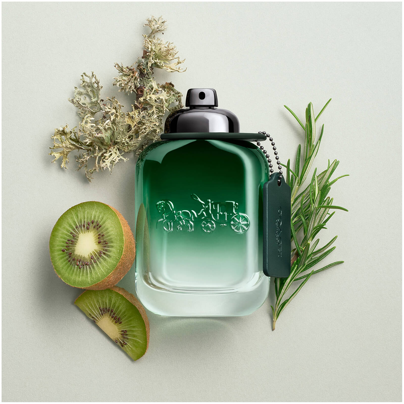 Coach - Green - Eau de ToiletteCoach Green; levendig, fris groen, ontspannend maar ook dynamisch. Het houtachtige, fruitige Eau de Toilette opent met een verfrissende topnoot van sappige Kiwi en krokant Bergamot, geaccentueerd door aromatische tonen van Rozemarijn en Geranium, gevolgd door aards Kristalmos en mannelijk Cederhout.De flacon heeft een verfijnd groen kleurverloop, geïnspireerd op de rijke, aardse tinten die in de natuur en in Coach Leathercraft voorkomen. Topnoten: kiwi-akkoord, bergamotHartnoten: rozemarijn, geraniumBasisnoten: kristalmos, cederhout