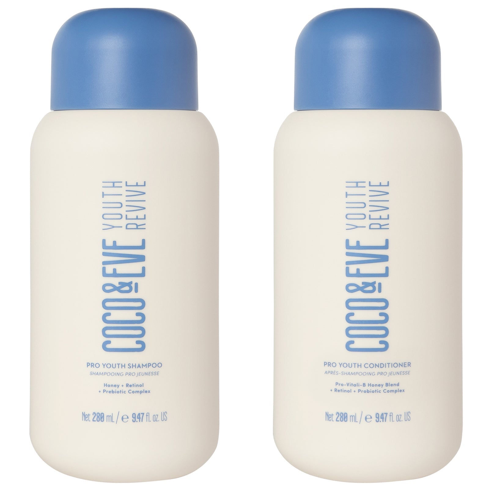 Transform the appearance of lacklustre hair with Coco & Eve’s Pro Youth Duo Kit. The two-piece set utilises potent ingredients commonly found in skincare formulations to improve the look of shine, volume and strength. Set Contents: Youth Revive Pro Youth Shampoo 280ml Working from scalp to ends, this clarifying shampoo cleanses the hair of product build-up and impurities, while simultaneously delivering a burst of hydration. Infused with a blend of probiotics, the formula also helps to minimise the appearance of flaking and dryness. Youth Revive Pro Youth Conditioner 280ml This moisturising formula combines coconut oil with honey to help minimise the risk of breakage and visibly thicken the lengths. The retinol-enriched conditioner is ideal for those with brittle strands, protecting and nourishing the scalp in order to promote optimal conditions for healthy-looking hair growth.
