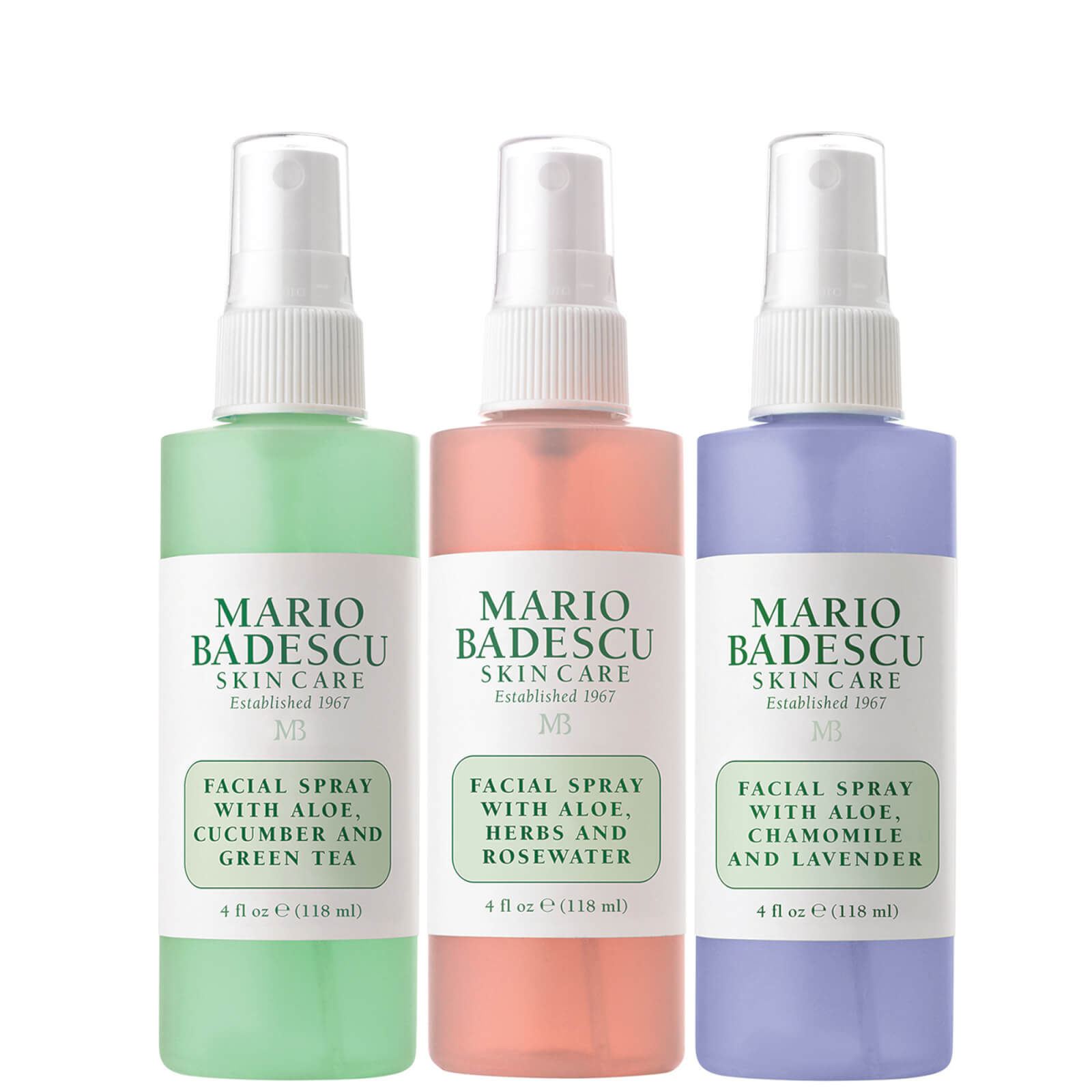 Deze driedelige set bevat de populaire gezichtssprays van Mario Badescu. Iedere spray kan waar en wanneer ook gebruikt worden—neem met gemak alle drie in uw routine van dag naar nacht op. De set bevat: Gezichtsspray met aloë, komkommer en groene thee (118ml): Wekt vermoeide huid met een versterkende verstuiving van botanische producten, rijk aan voedingsstoffen en etherisch water van pepermunt, vol antioxidanten. Gezichtsspray met aloë, kruiden en rozenwater (118ml): Laat uitgedroogde huid herleven met een dauwachtige gloed, overal en altijd. Een bloemig extract van rozen en gardenia's geeft uw teint een boost en onthult een stralende huid, vol van nieuwe energie. Gezichtsspray met aloë, lavendel en kamille (118ml): Voedt de huid met een kalmerende hydratatieboost. Etherisch water van kamille, vitamine C en lavendel zijn gecombineerd in een kalmerende mix die uw huid in balans brengt en opfleurt.