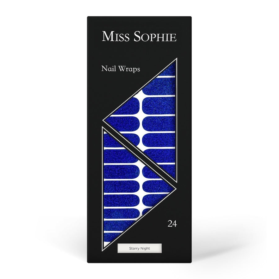 Diepblauw glitterdesignSterry Night laat je vingertoppen fonkelen! De nagelfolie van Miss Sophie glinstert met de diepblauwe sterrenhemel en zet met gemak glamoureuze accenten - ook in combinatie met het Night Sky design!