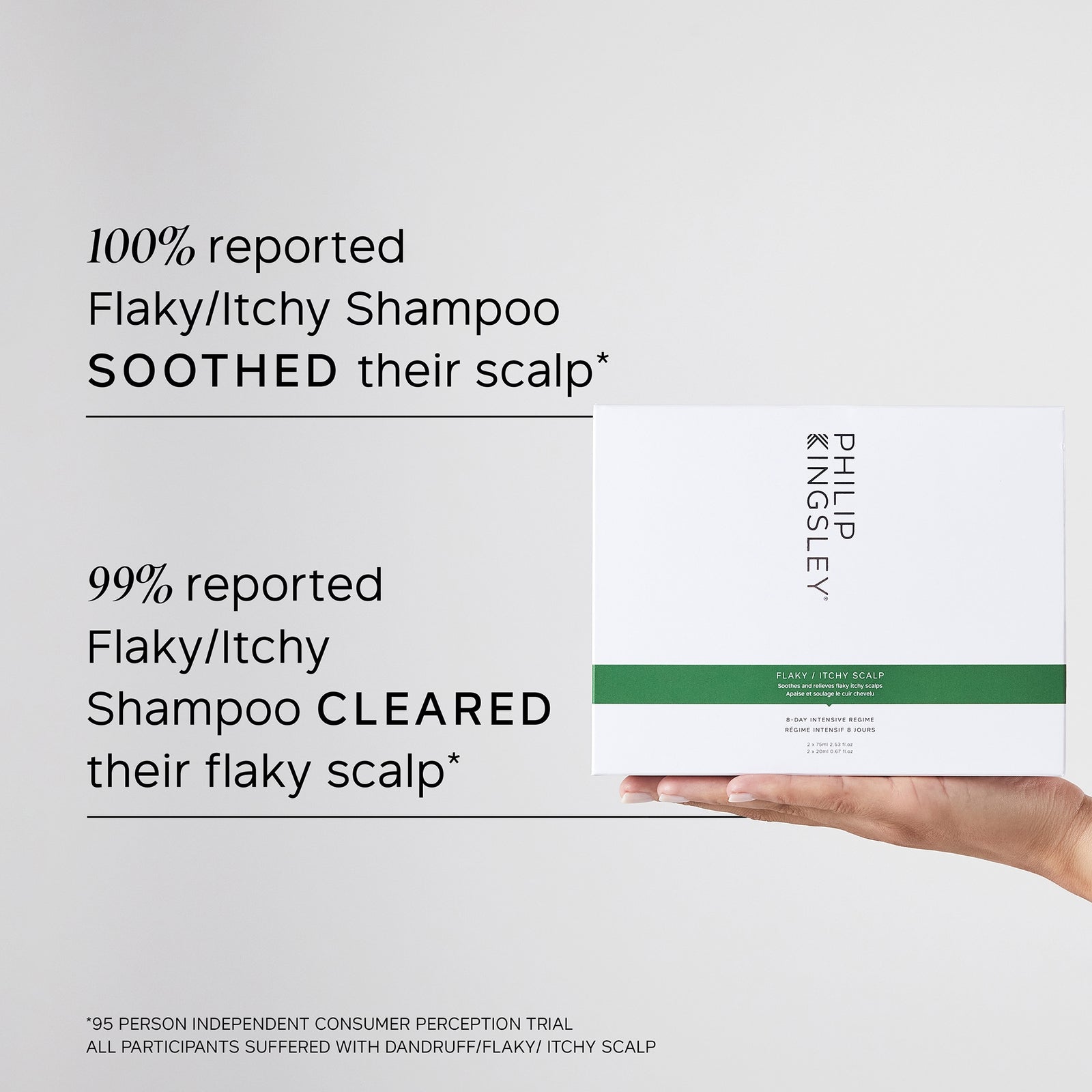 Philip Kingsley's Flaky/Itchy Scalp 8-Day Kit is an intensive regime to help relieve flaky, itchy scalps. Suitable for all hair types. The Set Contains: 2 x Flaky/Itchy Scalp Mask (20ml) The nourishing treatment is enriched with anti-fungal Piroctone Olamine and Salicylic Acid to gently sweep away dandruff and impurities whilst replenishing deep hydration to ease itchiness. Antioxidant Green Tea Extract defends against environmental aggressors to promote a calm, comfortable and healthy scalp environment. 1 x Flaky/Itchy Scalp Shampoo (75ml) A gentle yet effective formula that helps to relieve itching and irritation for long-lasting comfort. Mild enough for daily use, the anti-dandruff shampoo eliminates flaking and build-up, whilst soothing the scalp and leaving hair feeling soft, shiny and manageable from root to tip. Imparts a pleasant Apple fragrance. Suitable for vegetarians and vegans. 1 x Flaky/Itchy Scalp Toner (75ml) Soothes and calms sensitive scalp. Enriched with an anti-microbial and anti-flaking formula, it gives immediate and long-lasting relief from irritation. Clear and odourless, it's safe to use on colour-treated hair.