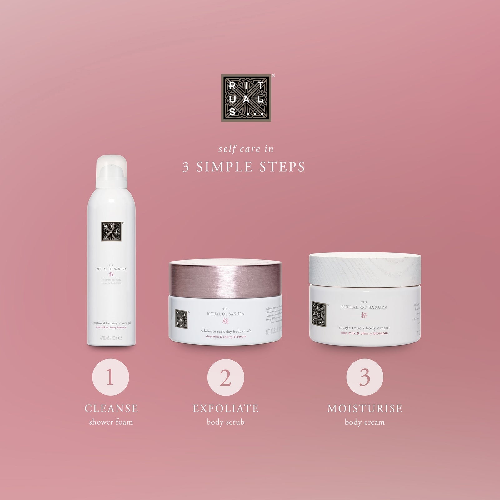The perfect gift for yourself or a loved one, the Ritual of Sakura set by Rituals invites you to indulge in a moment of self-care with its refreshing floral fragrance and sensorial textures. Set Contents: Ritual of Sakura Foaming Shower Gel 50ml This rich gel-to-foam body wash removes impurities from the skin without stripping away its natural oils. After use, the cleanser leaves skin feeling refreshed from top to toe with a silky-soft feel. Ritual of Sakura Body Scrub 125g Formulated with sugar, this plant-powered exfoliator buffs away dead surface cells for soft, luminous-looking skin. Supported by jojoba oil, the scrub nourishes with every application. Ritual of Sakura Body Cream 70ml Discover the best-selling body cream by Rituals. The velvety moisturiser provides instant and long-lasting hydration to the skin with a blend of vitamin E, centella asiatica and antioxidants. The multi-purpose cream also helps to visibly firm.