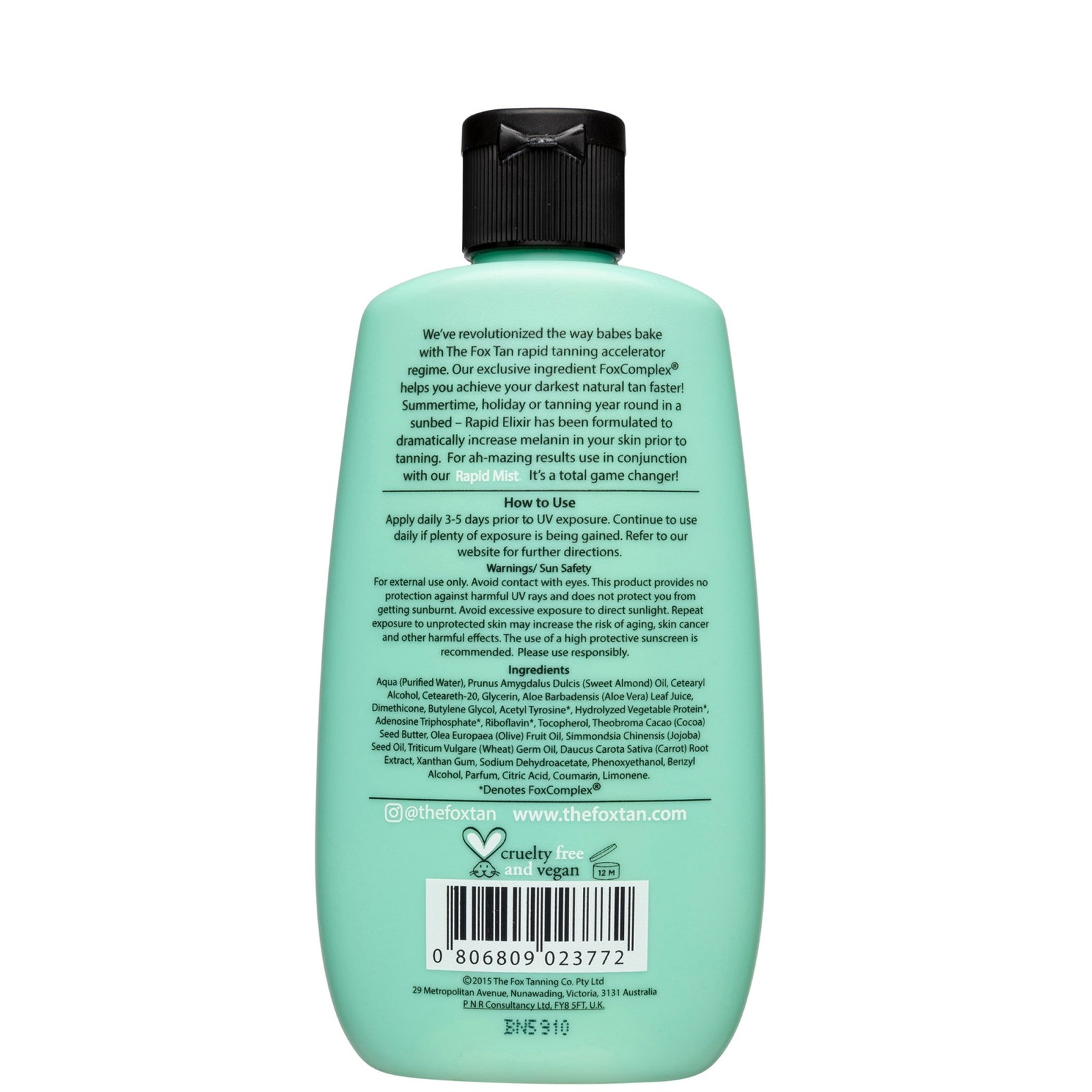 De Fox Tan Rapid Tanning Elixir: Maximale bruiningHaal het maximale uit je zonnebad met The Fox Tan Rapid Tanning Elixir: Nog voordat je gaat liggen bij het zwembad, op het strand of onder de zonnebank, bevordert de unieke formule de melanineproductie van de huid, wat zorgt voor de meest intense en best mogelijke bruining. De zijdezachte lotion is verrijkt met kokosnootboter, wortelextract, jojoba- en amandelolie om de huid intensief te voeden en te hydrateren.
