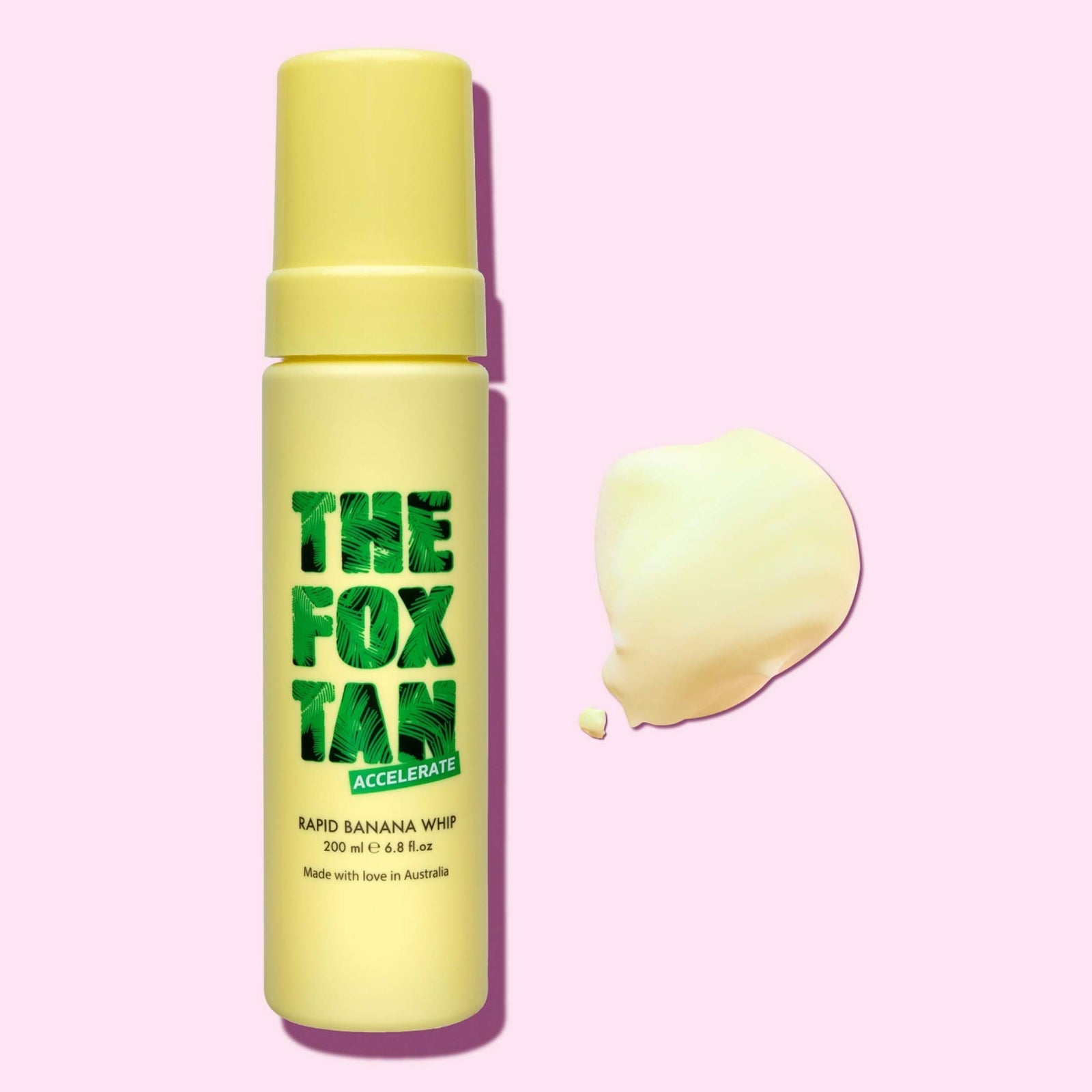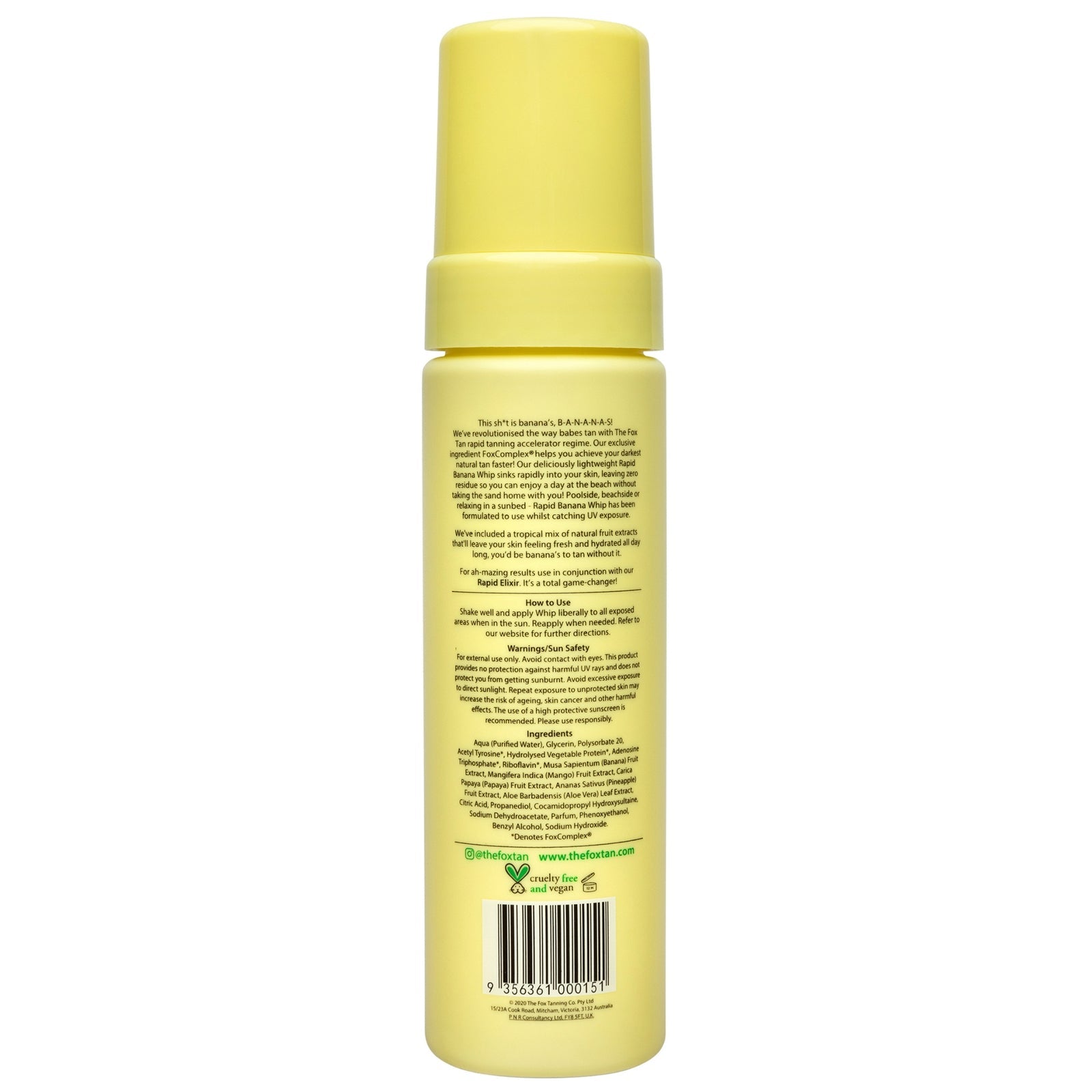 De Fox Tan Rapid Banana Whip: snel bruin wordenWil je in een handomdraai een mooie bruine teint zonder de hele dag te moeten zonnebaden? Dan is de Rapid Banana Whip van The Fox Tan de perfecte oplossing: terwijl je ontspant in de zon versnelt het ultralichte schuim het natuurlijke bruiningsproces van je huid en betovert het je zintuigen met zijn fruitige zomergeur. De unieke formule is gebaseerd op het exclusieve ingrediënt FoxComplex®, dat de melanineproductie stimuleert, wat bekend staat als het actieve ingrediënt in je huid dat leidt tot een bruine teint. Het schuim is ook verrijkt met natuurlijke fruitzuren die de huid de hele dag fris en gehydrateerd houden.